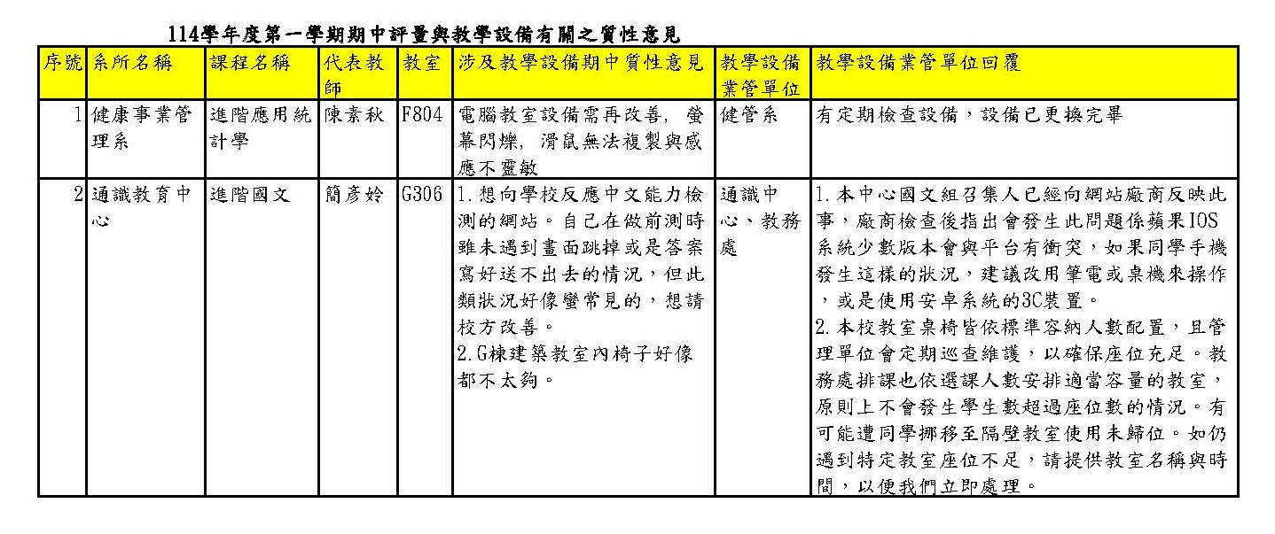 【教務處公告】114學年度第一學期學生期中質性意見教學設備業管單位分享回饋表